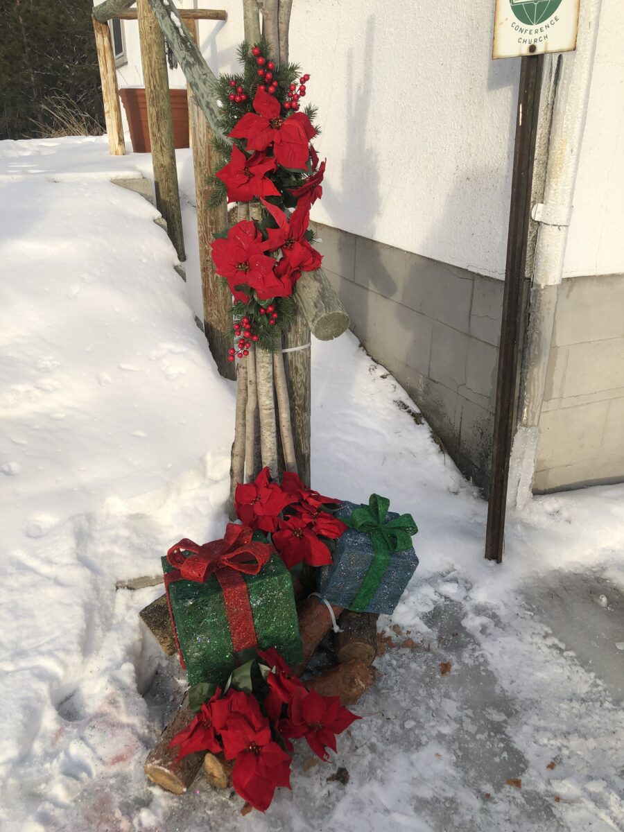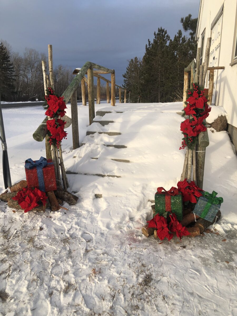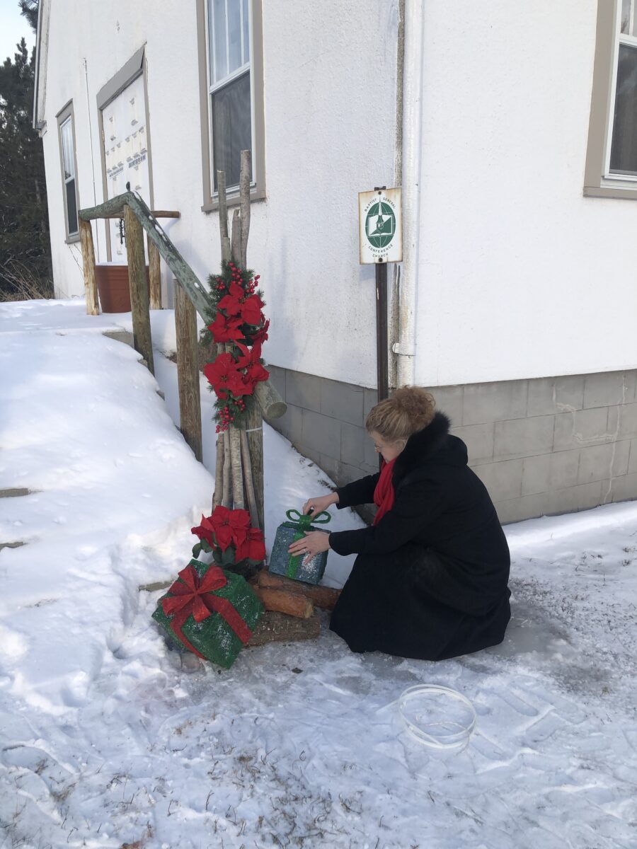 Below are Christmas decorations Lorraine created for outside the Waskish Baptist Church