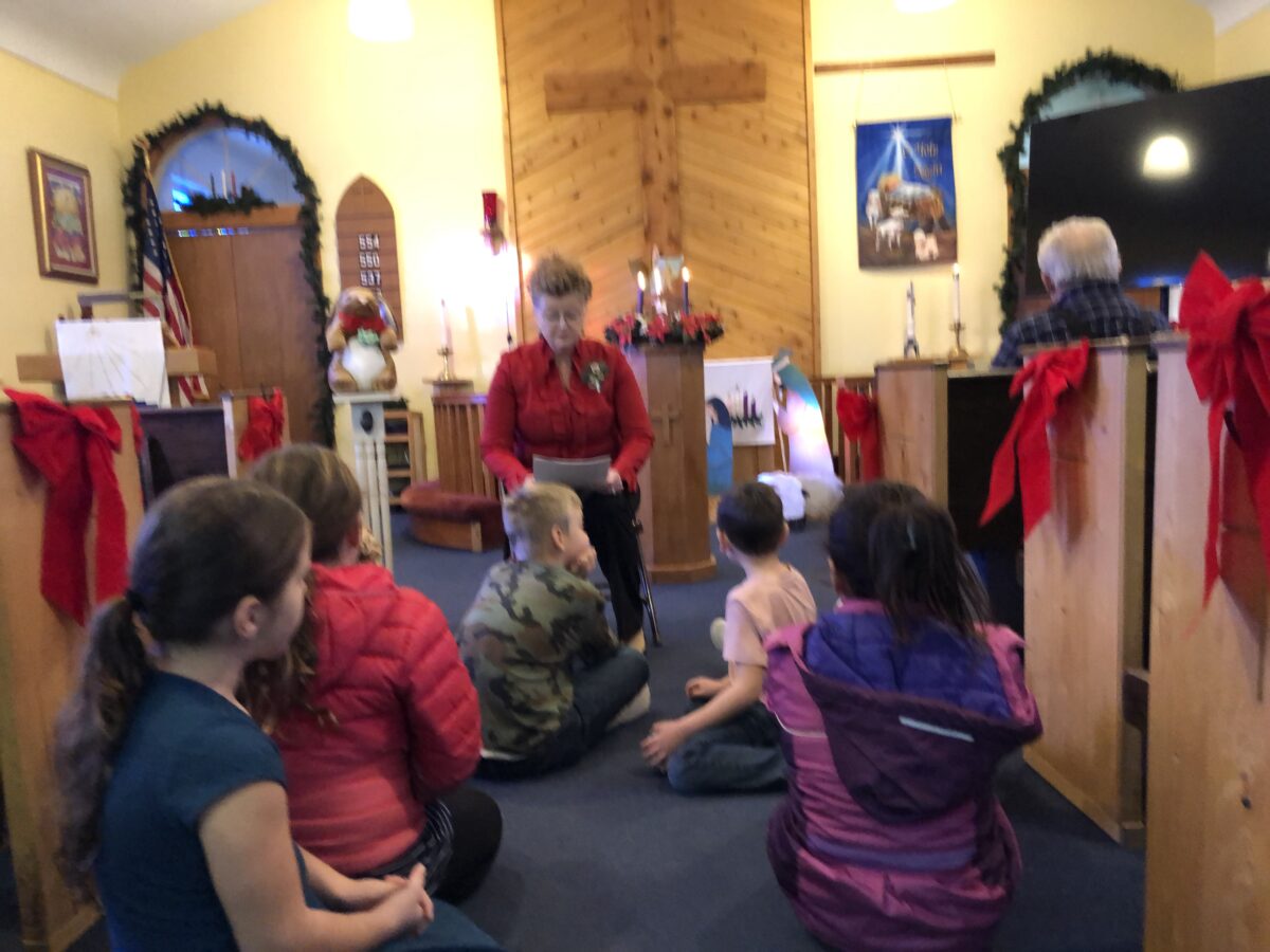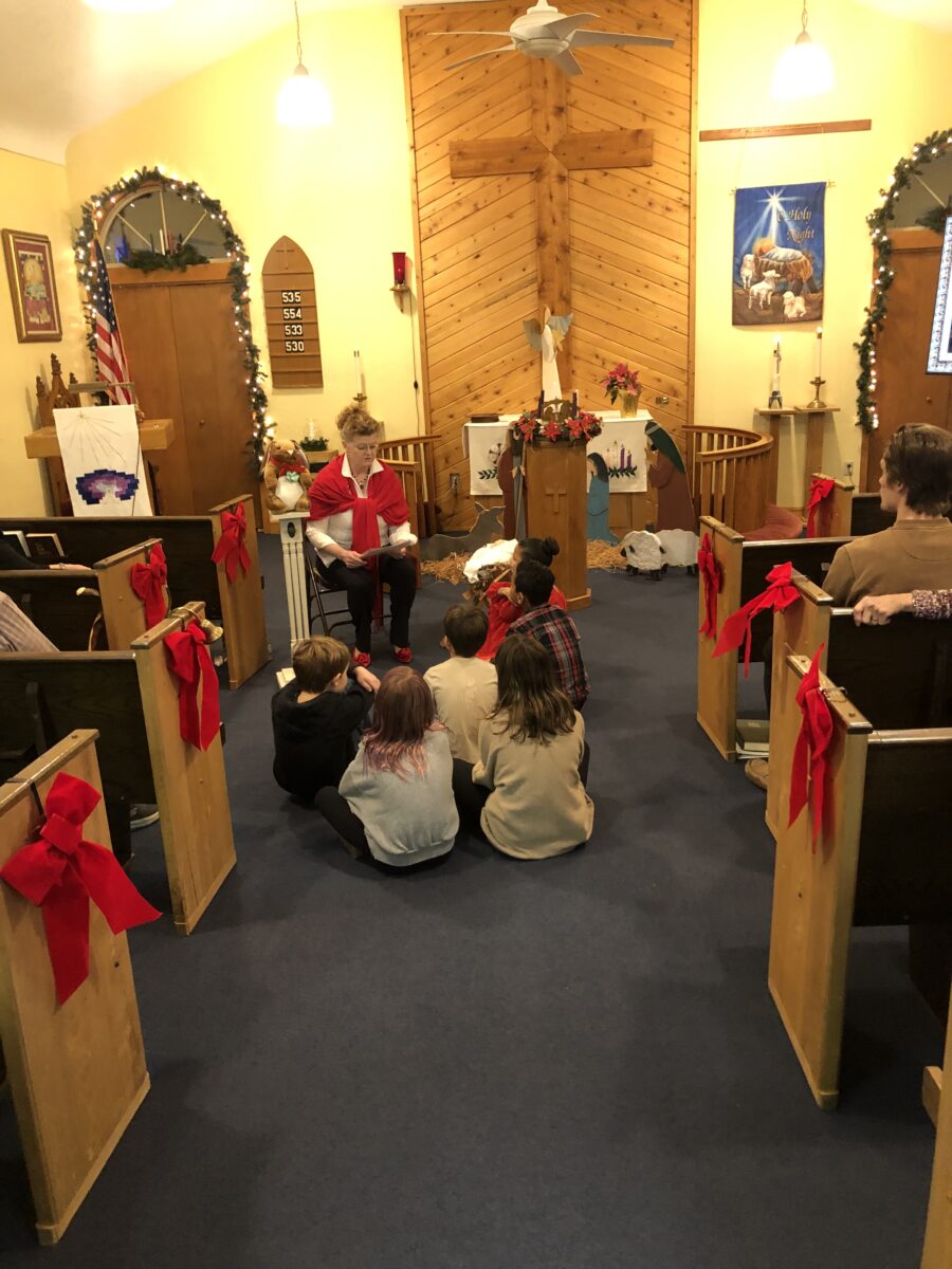 Below is Lorraine reading a story she wrote about a bunny to 6 children at the Christmas Eve service held at the Lutheran Church